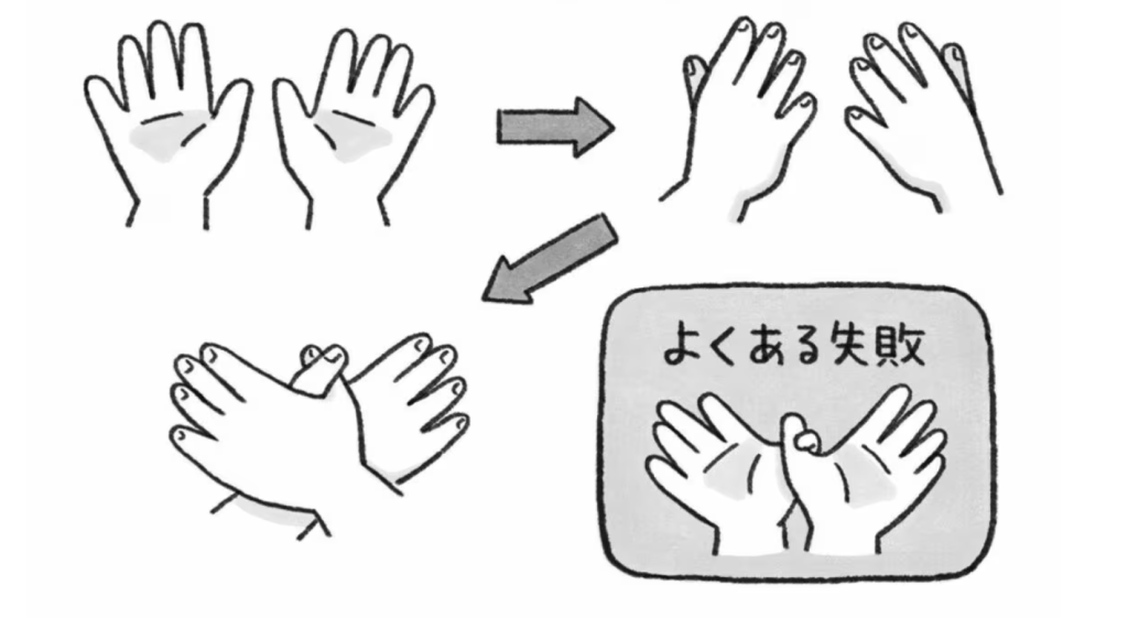 ③ Xoay tay trái và tay phải theo hướng ngược nhau, ngón cái của bàn tay trái thẳng hàng với ngón út của bàn tay phải và ngón út của bàn tay trái thẳng hàng với ngón cái của bàn tay phải. Việc bạn xoay tay theo hướng nào không quan trọng.